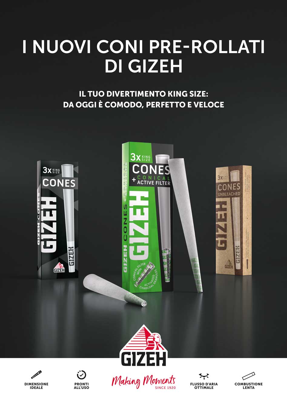 GIZEH Cones are pre-filled long papers, perfect for both beginners and those familiar with the sector who prefer a ready-made solution rather than preparing their own cigarettes from scratch. These pre-rolled cones are available in packs of 3, in 3 different versions: GIZEH Brown Cones + Tip with unbleached paper and filter, GIZEH BlackĀ® Cones + Tip with bleached paper and filter, and finally, GIZEH BlackĀ® Cones with a conical Active Filter, featuring bleached paper and a conical filter with active carbon.